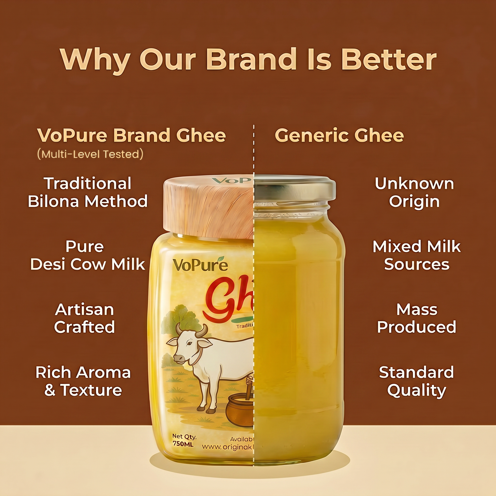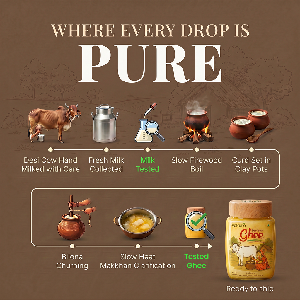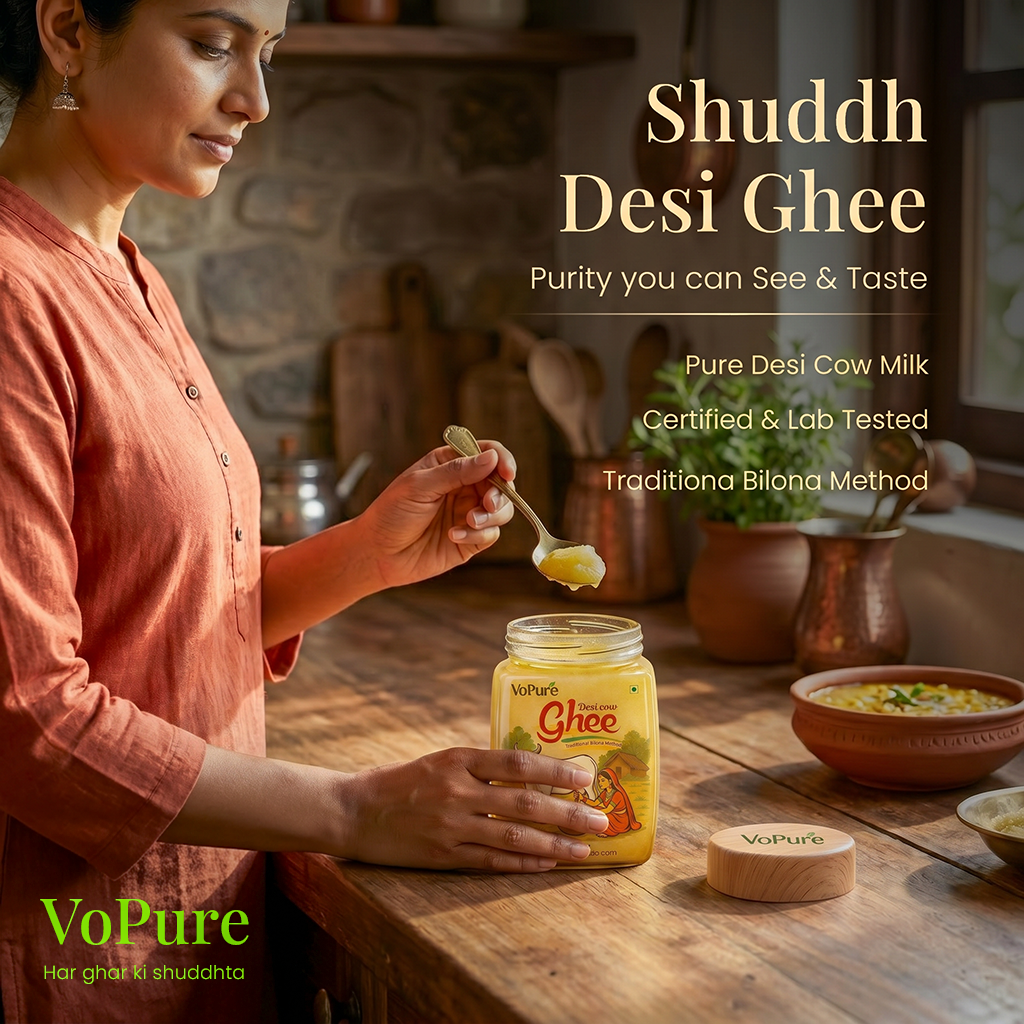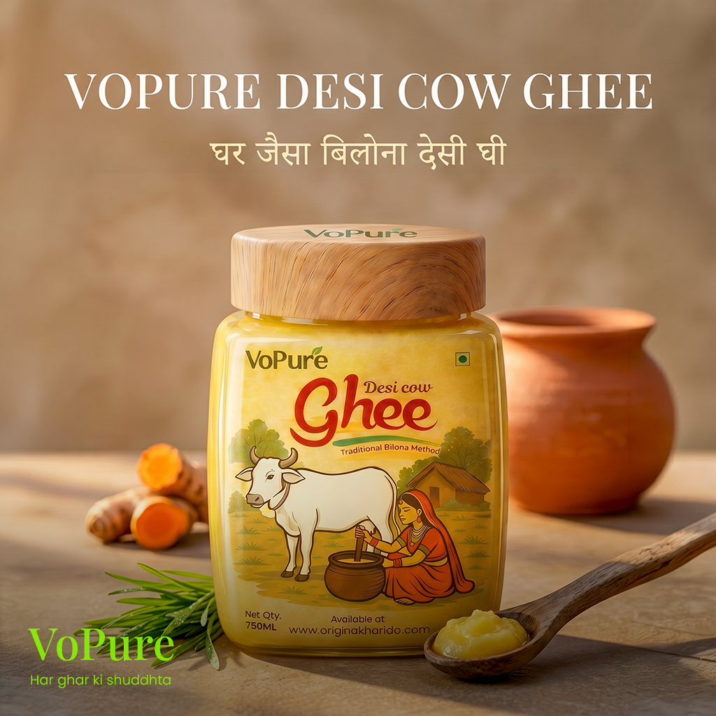 Cow Desi Ghee is a premium-quality traditional ghee made from the milk of free-grazing cows using the ancient Bilona method and the ghee multilevel tested. Crafted with care by Original Kharido , this ghee delivers authentic taste, natural aroma, and assured purity in every spoon.